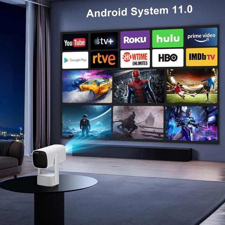 با بهرهگیری از سیستمعامل Android 11، این پروژکتور عملاً یک تلویزیون هوشمند قابلحمل است. شما میتوانید بدون نیاز به دستگاه جانبی، مستقیماً از طریق Wi-Fi به اپلیکیشنهایی مثل YouTube، Netflix، Disney+ و Amazon Prime Video دسترسی داشته باشید.