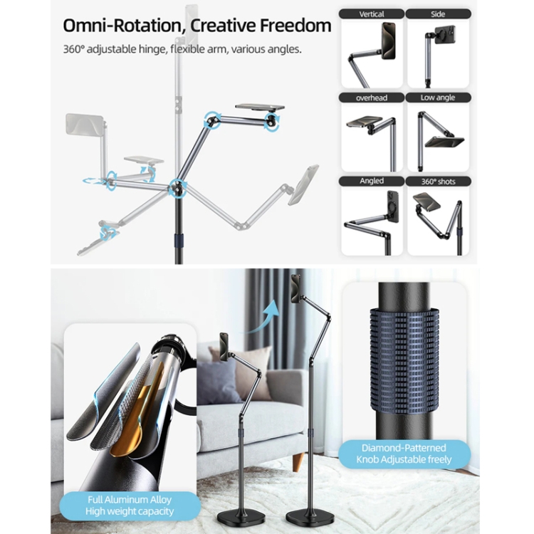 قابلیت چرخش ۳۶۰ درجه و ارتفاع قابل تنظیم بین ۶۰ تا ۱۶۰ سانتی‌متر این هولدر را به گزینه‌ای همه‌کاره تبدیل کرده است. علاوه بر این، پایه فلزی با پد ضدلغزش EVA، ثبات بسیار بالایی حتی روی سطوح لغزنده ایجاد می‌کند.