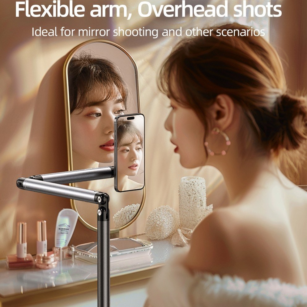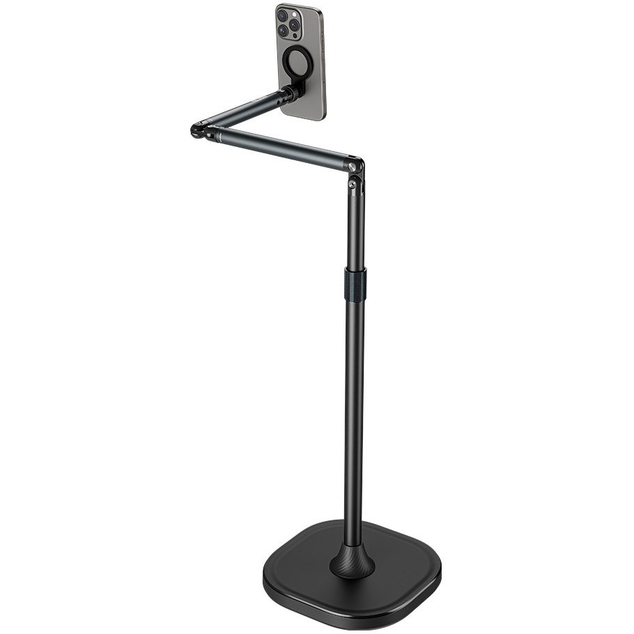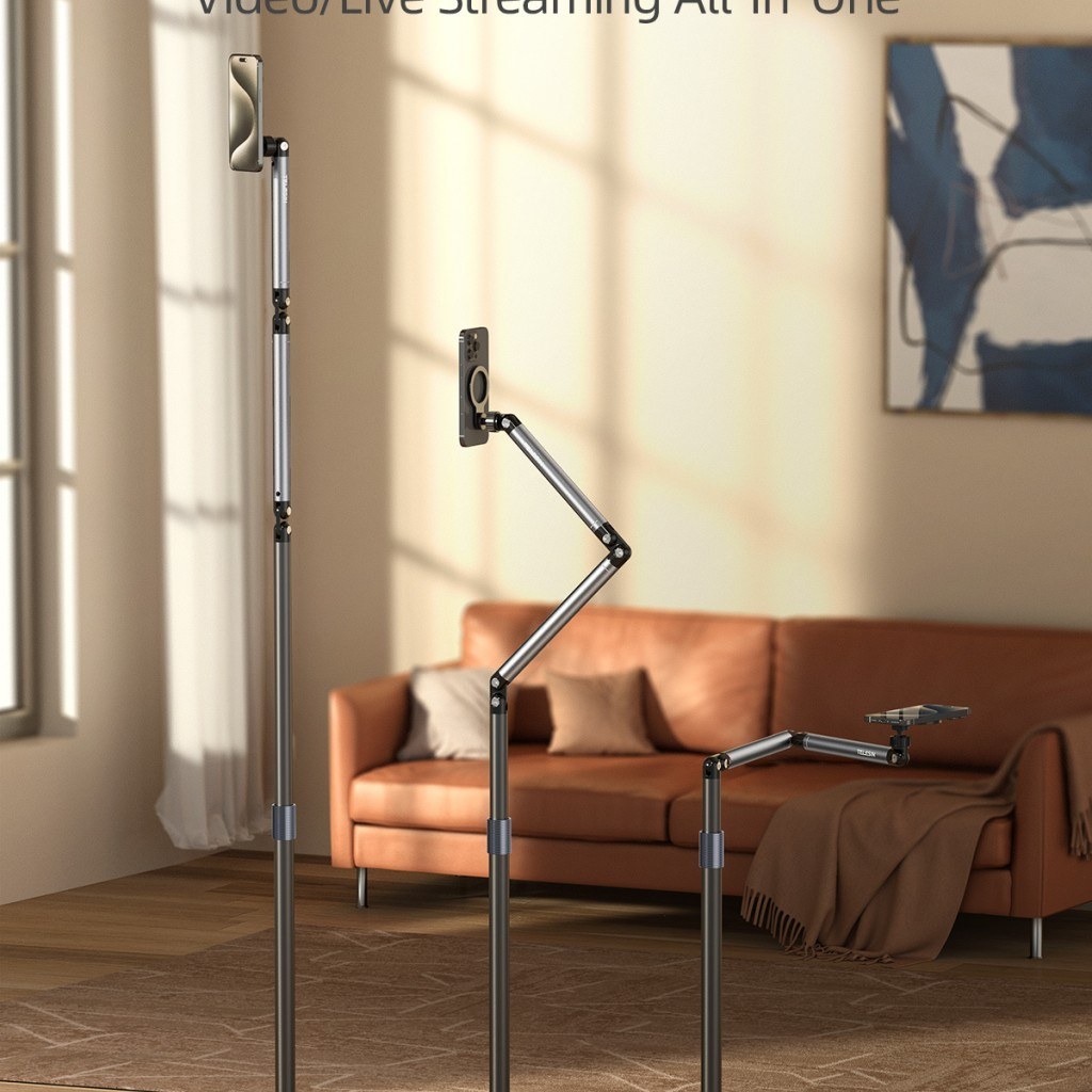 قابلیت چرخش ۳۶۰ درجه و ارتفاع قابل تنظیم بین ۶۰ تا ۱۶۰ سانتی‌متر این هولدر را به گزینه‌ای همه‌کاره تبدیل کرده است. علاوه بر این، پایه فلزی با پد ضدلغزش EVA، ثبات بسیار بالایی حتی روی سطوح لغزنده ایجاد می‌کند.